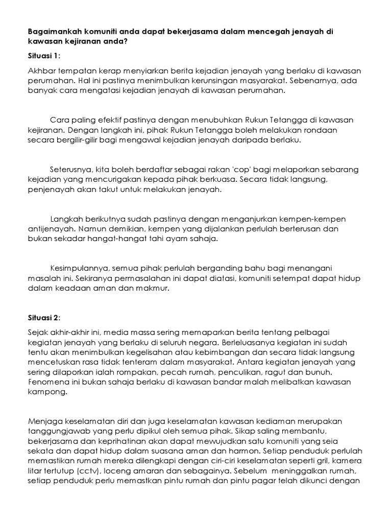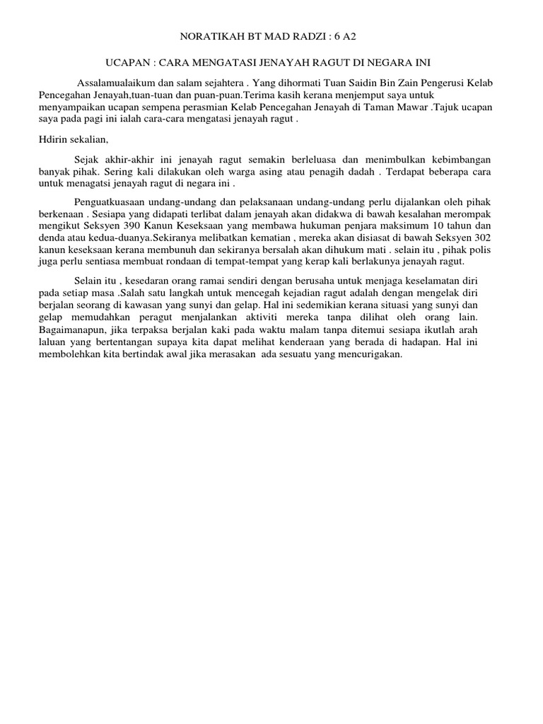 Peribahasa dan penanda wacana yang berkait dengan huraian pelajar wajar. I) wanita perlu mempelajari seni mempertahankan diri bagi mengelakkan diri menjadi mangsa ragut. Punca dan langkah mengatasi jenayah ragut. Hal ini berpotensi disebabkan oleh kurangnya kesedaran jasmani emosi rohani dan intelek jeri dalam diri peragut selain kedaifan perspektif mereka terhadap agama. Kehausan wang = mata duitan / terlalu mengejar wang. Published on sun, 22 jul 2012. Langkah langkah mengatasi dan membendung masalah jenayah. Membejat = mengurang / mengekang / menghalang. Langkah mengatasi jenayah ragut karangan for more information and source, see on this link : Janganlah kita mengambil sikap sambil lewa dan hanya akan sedar sekiranya berlaku kematian dalam kalangan mangsa ragut seperti kata pepatah 'sudah terhantuk baru terngadah'. Menurut mereka peragut terpanggil melakukan jenayah kerana didorong oleh penampilan mangsa yang membawa beg tangan dengan penuh gaya tanpa memikirkan keselamatan atau memakai barang kemas yang tidak sepatutnya semasa berada di tempat awam. Langkah mengatasi jenayah ragut.antara inisiatif yang dapat kita ambil sebagai langkah mencegah jenayah dalam kalangan remaja yang merupakan isu terpenting di negara ini ialah pihak berkuasa perlu mewujudkan konsep bandar dan pekan selamat. Namun ramai dalam kalangan pelajar mengalami kesulitan untuk menjawab soalan yang melibatkan penulisan karangan oleh itu berikut adalah contoh karangan langkah langkah menangani jenayah ragut di malaysia sebagai rujukan untuk semua.