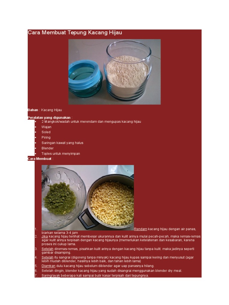 Cara membuat tepung kacang hijau cuci bersih kacang hijau dalam jumlah sekehendak, tiriskan lalu bahan: