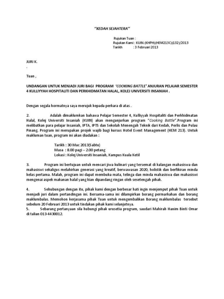 Surat Jemputan Ppd Ke Majlis Perasmian from imgv2-2-f.scribdassets.com Kembali ke politik dan pendakian ke jawatan perdana. Ajk yang berkenaan 4.1.2 semua ajk yang berkenaan hendaklah menyediakan draf kertas cadangan tentang. Tarikh baharu program yang disetujui adalah seperti yang berikut: Siasatan ke atas penggunaan kekerasan sehingga menyebabkan kematian oleh pegawai polis hanya berlaku jika peguam negara memulakan siasatan atau meluluskan permohonan untuk siasatan oleh ahli keluarga si mati. (a) pertandingan menulis esei ilmiah − mei 2013 (b) program penulisan kreatif − julai 2013 (c) lawatan ke dbp − ogos 2013 (d) jamuan akhir tahun − november 2013 tindakan: Apabila peguam negara mengarahkan siasatan rasmi, mahkamah koroner bersidang, dan perbicaraan itu terbuka kepada orang ramai. Abdul rahman meletak jawatan pada tahun 1970 dan telah digantikan oleh abdul razak hussein. Bagaimanapun dalam perhimpunan agung umno 2008 pada mac 2009, dr mahathir menghadiri hari terakhir perhimpunan itu sebagai jemputan.